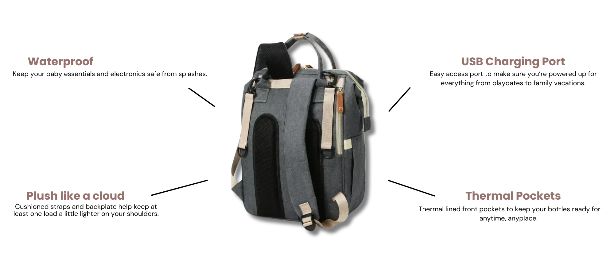 A modern design for on-the-go families. Its waterproof, spacious, and thoughtfully organized. With built-in USB charging, it keeps you ready for wherever the day takes you.